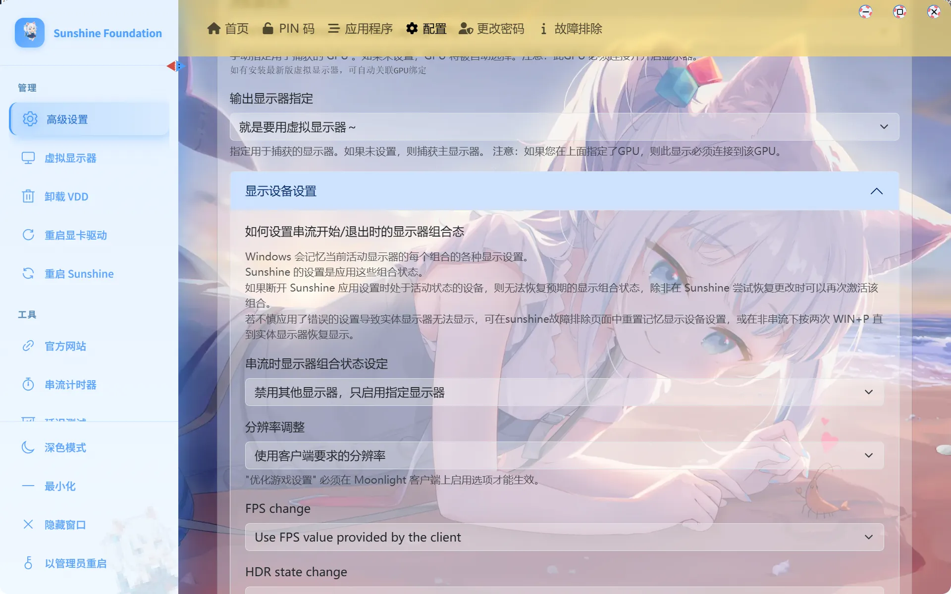 1.无操作:字面意义,没什么用 2.自动激活指定显示器:会激活虚拟创建Moonlight所选对应分辨率帧率,Moonlight端会变为副屏(副屏的意思就是拓展屏)也可以串流过去自己按win+p切换到拓展 3.自动激活指定显示器并设置为主显示器:激活创建对应分辨率,Moonlight端变为主屏,你的主显示器变为副屏 4.禁用其他显示器,只启用指定显示器:激活创建对应分辨率,Moonlight端显示画面,其他显示器禁用熄灭,也就是息屏串流,游戏玩家建议选择第4个