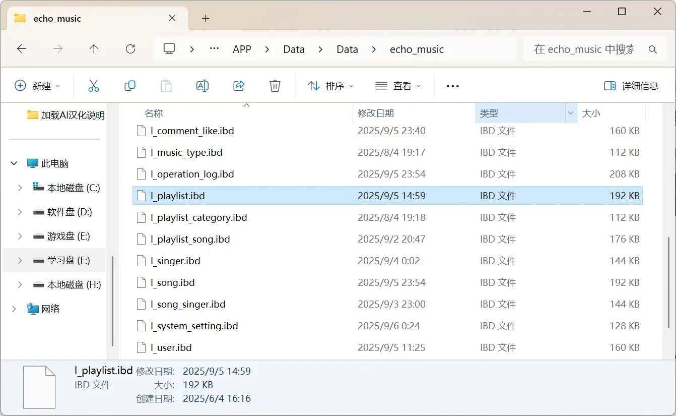 看着之前的笔记安装完数据库,我突然发现,不知道是版本略有差异还是 MySQL 的配置问题,我把之前的数据直接 Copy 到新的 Data 下,结果没有正常读取,甚至直接停止运行了,然后我又重装了一遍,试着把一个数据库复制过去,也是没法正常使用,这时候我有点慌了,看了看文件夹,发现里面是一堆后缀为”.ibd”的文件,除了我熟悉的表名,还有一堆不知道的名字。
